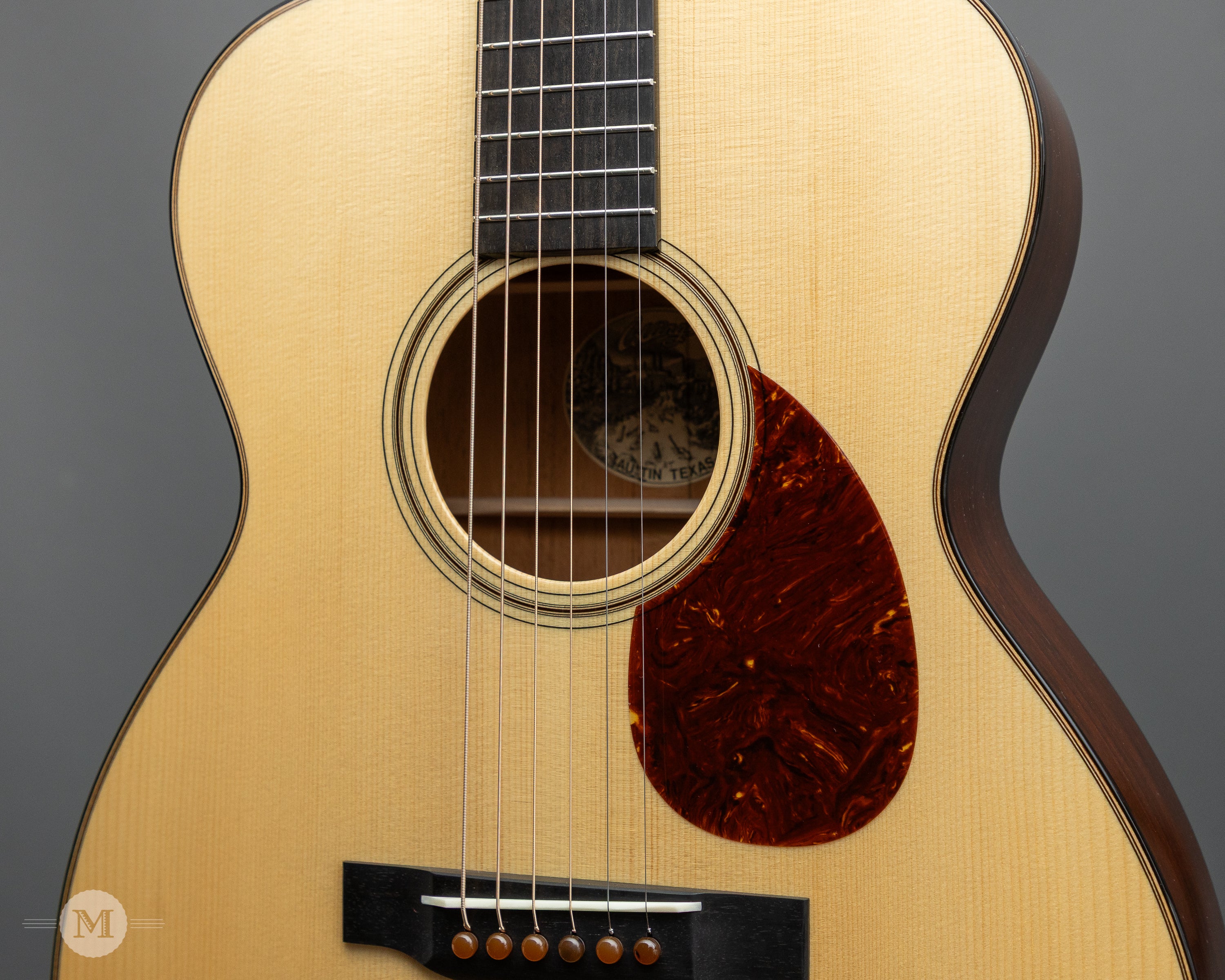 - Adirondack Spruce top with Tortoise-style pickguard with toner and wood purfling